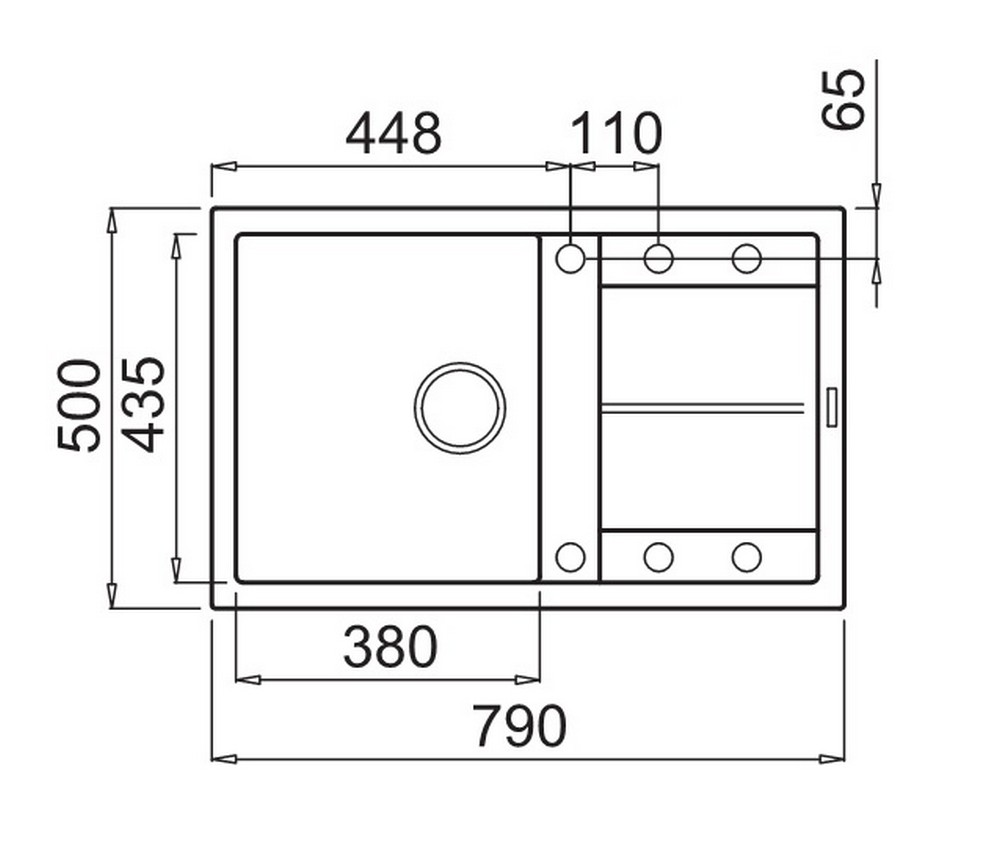 Integrovaná oblast pro příslušenství v odkapávači, vybavená předvrtanými otvory, které vám umožňují instalovat doplňky: excentrické ovládání odpadu, dřezovou baterii s vytahovací sprchou a dávkovač saponátu.